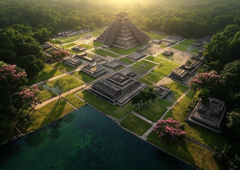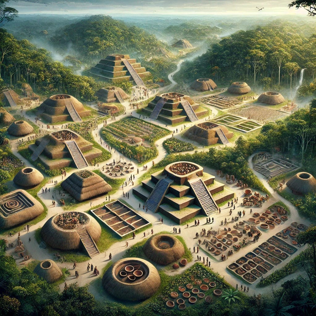 An artistic depiction of how the ancient Amazonian cities in Ecuador's Upano Valley might have appeared 2,500 years ago. This image illustrates interconnected urban centers with central plazas, ceremonial mounds, and extensive roads. There would have been Savanah plains and bamboo forests surrounding the area with small pockets of cultivated fruit trees, instead of vast areas of jungle which was established later as nature reclaimed the ruins.